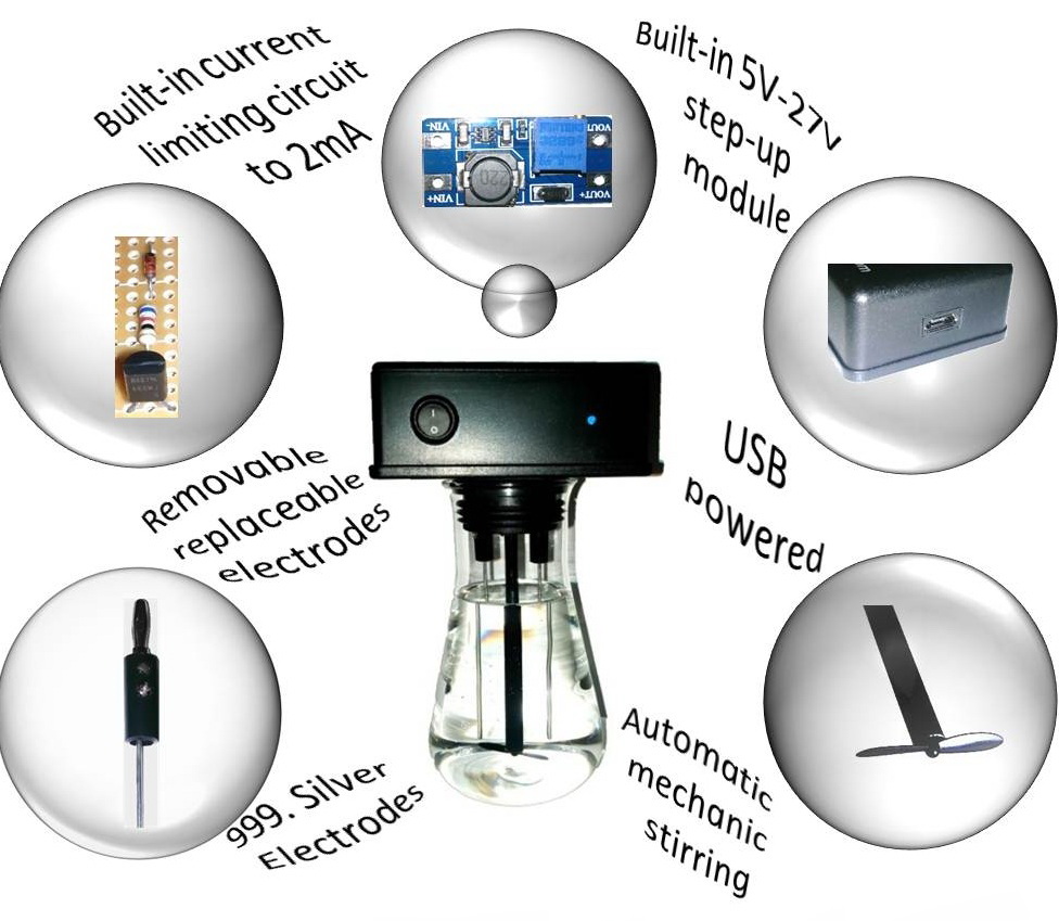 Fit for purpose: Our product is designed to produce the smallest particles in size with range from 001 to .01 microns (10 to 100 angstroms) or (1 to 10 nano-meters). That is the size of silver particles that best absorb light in the indigo range, leaving only its inverse color, transparent to yellow, to be observed. It has a build-in step-up power module converting 5V to 27 volts and current limiting circuit output to 1mA.